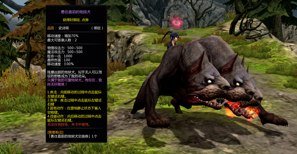 勇往直前的地狱犬交换券不可交易,可以在坐骑商店兑换双人坐骑【勇往直前的地狱犬】,属性和外观如图所示