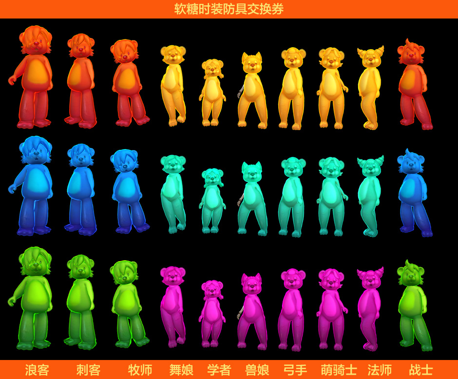 道具介绍:软糖时装防具交换券,2件套,低级,无属性,3色可选,不可交易。【查看外观】