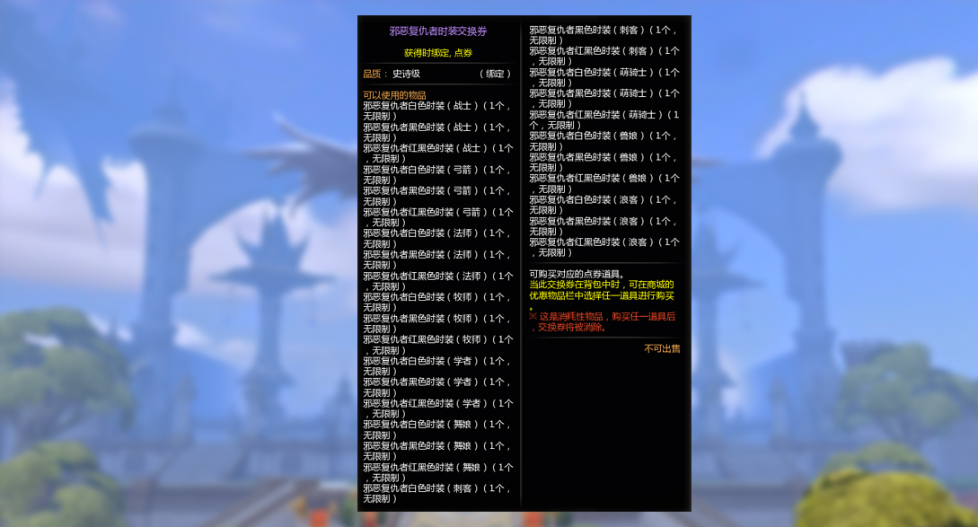 1.邪恶复仇者礼包兑换券 (10职业,5件套,3色可选)。
